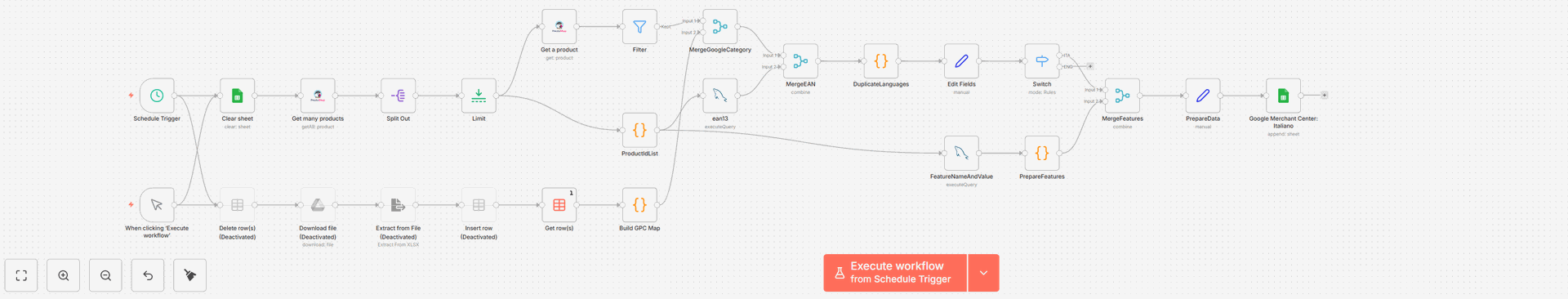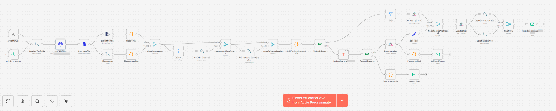 Per i prodotti esistenti o appena creati, il workflow aggiorna i campi necessari, come disponibilità, costi, produttore, fornitore e altre informazioni rilevanti per il catalogo.
