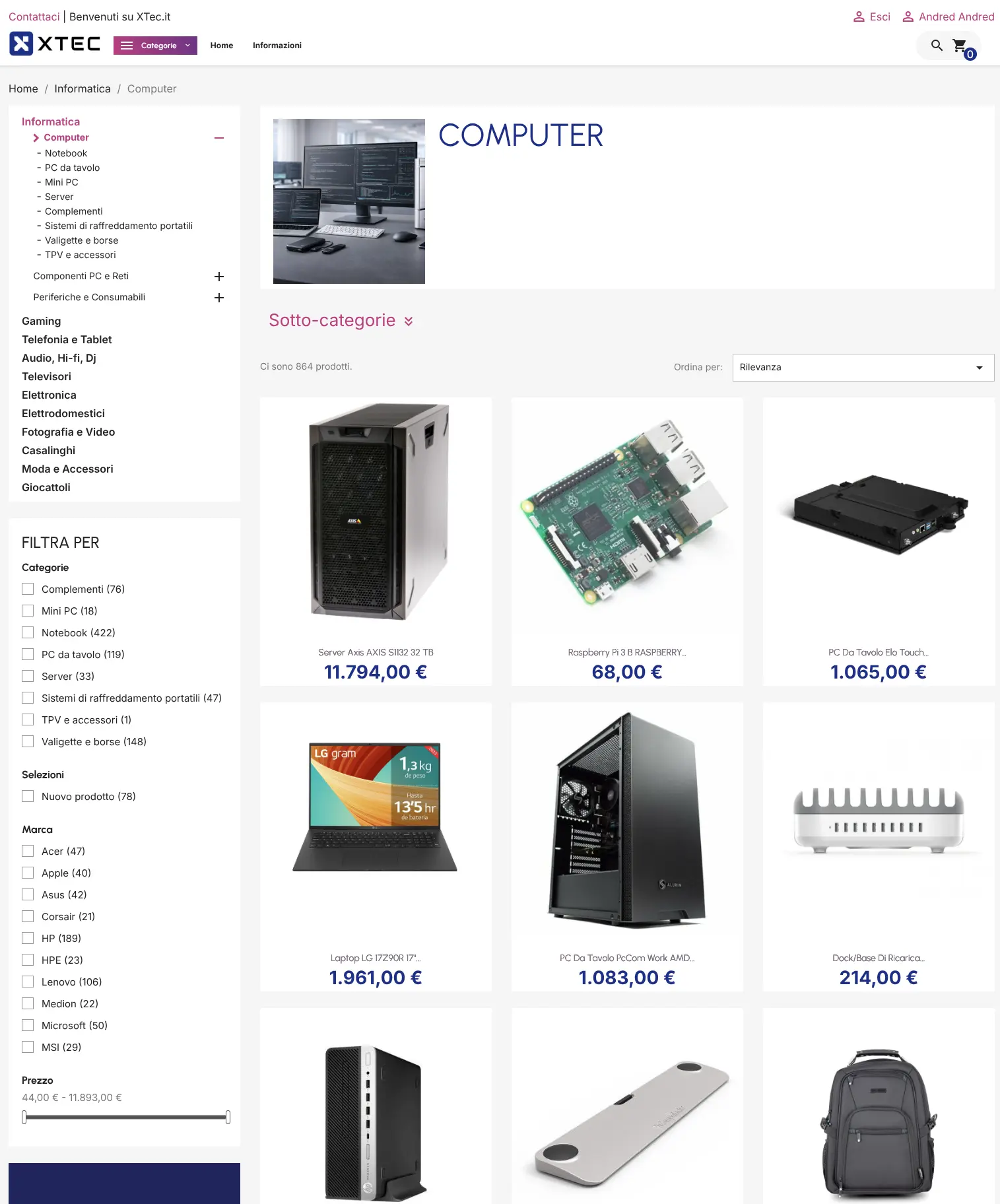 Pagina categoria progettata per ricerca e confronto rapidi: banner di reparto, griglia prodotti pulita, ordinamento per rilevanza e navigazione a breadcrumb. Sidebar completa con menu categorie e filtri (faceted) per marca, prezzo e sotto-categorie, così da restringere subito i risultati.