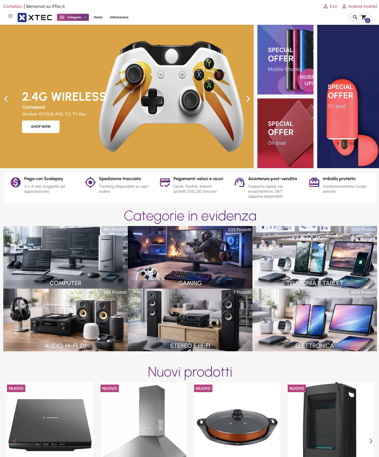 Homepage impostata come vetrina e-commerce: slider promozionale, blocchi “reassurance” (pagamenti, spedizioni, assistenza) e categorie in evidenza con accesso immediato ai reparti principali. Sezioni dinamiche (nuovi prodotti/featured) per valorizzare novità e offerte mantenendo la navigazione semplice.